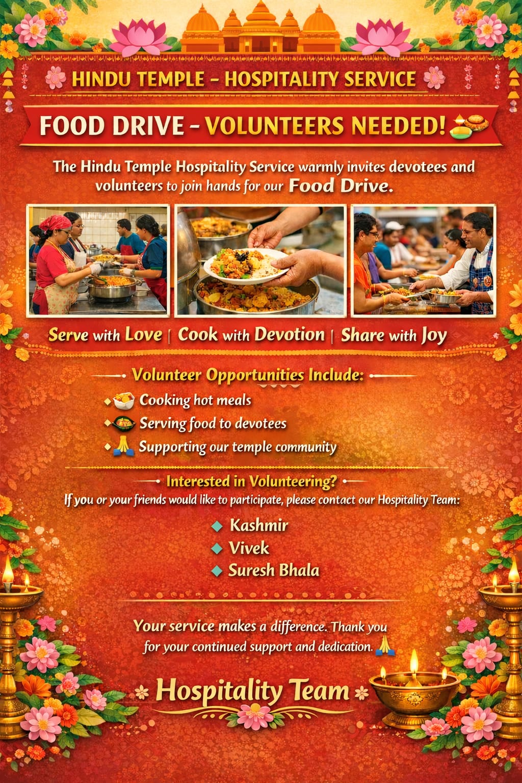 Anyone in the community can volunteer by either cooking, donating items, serving during the festivals, cleaning the kitchen etc..