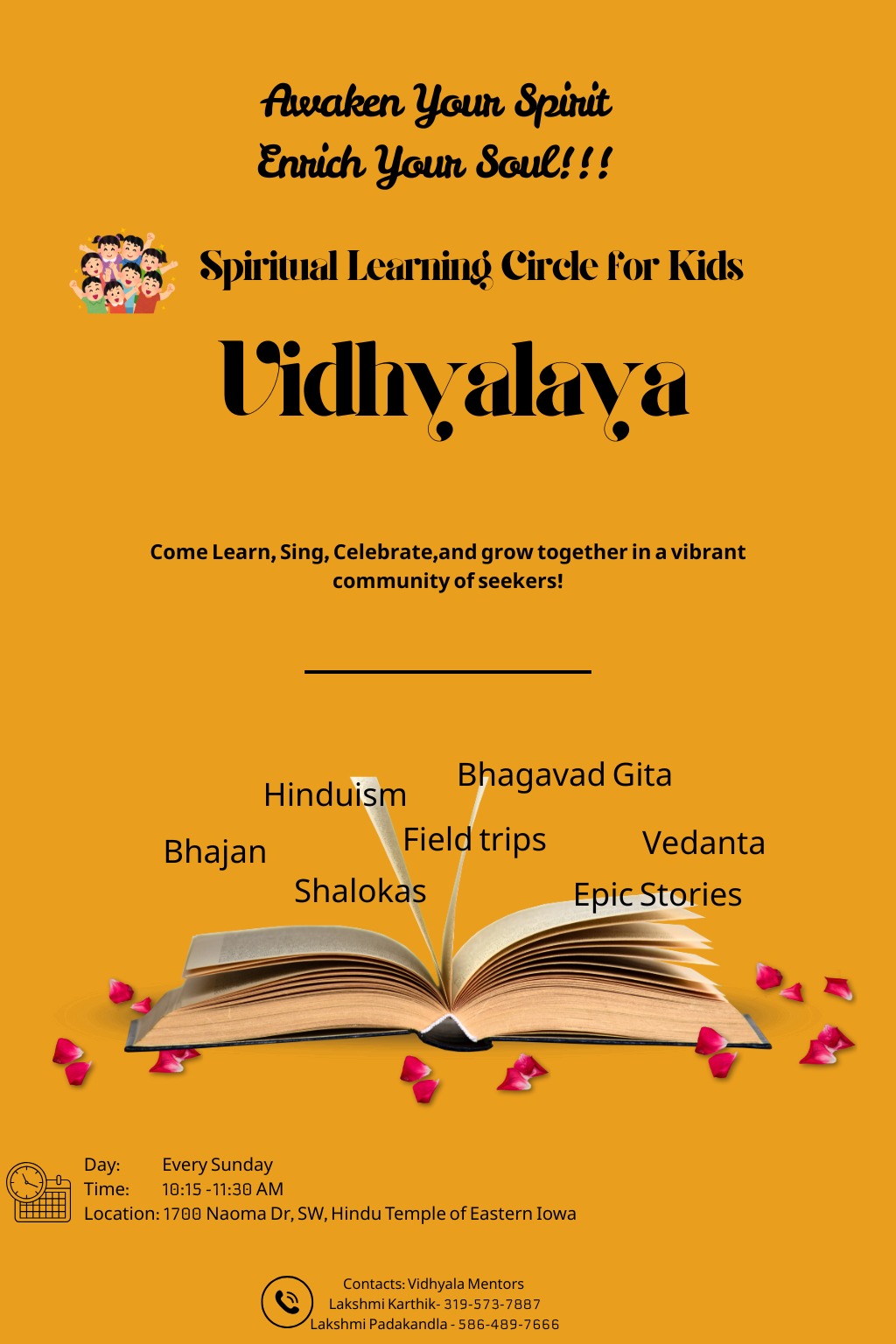 An important aspect of Hinduism is to educate our Youth about our culture and religion. The Hindu temple of Eastern Iowa achieves this through our unique program, Vidyalaya. The focus of this program is to help our youth understand our rich Hindu culture, our scriptures, rituals and Dharma. This program aids an individual to become a better person and advance in their spiritual Saadana. Parents are welcome to join along and benefit from this program.